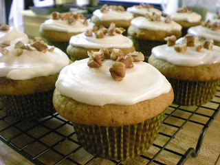 For the frosting, cream the butter and cream cheese until combined, add the vanilla and the confectioner's sugar. Frost the cupcakes and top them with chopped nuts when they are completely cooled.